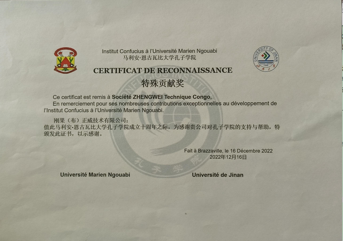 On December 16, the Confucius Institute at the Marien Ngouabi University in the Republic of the Congo celebrated its 10th anniversary, to which WIETC Zhengwei Technique was invited and received the Award of Special Contributions. The Minister of Higher Education of the Republic of the Congo  Adouki , Chinese Ambassador to the Republic of the Congo Ma Fulin, and Rector of the Marien Ngouabi University Onzoto attended the event and delivered congratulatory speeches.