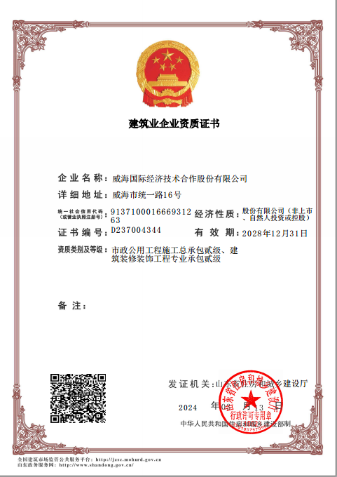 市政公用工程施工總承包貳級、建筑裝修裝飾工程專業(yè)承包貳級資質(zhì)證書