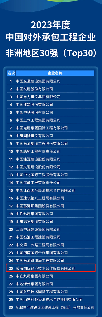 5月7日、2024対外請(qǐng)負(fù)工事業(yè)界発展大會(huì)の開(kāi)催期間中、中國(guó)対外請(qǐng)負(fù)工事商會(huì)は2023年度中國(guó)対外請(qǐng)負(fù)工事企業(yè)に関する複數(shù)のランキングを発表した。會(huì)社は中國(guó)対外請(qǐng)負(fù)工事企業(yè)ベスト100選(65位)、住宅建設(shè)工事ベスト30選(25位)、アフリカ地區(qū)事業(yè)ベスト30選(25位)に選ばれ、會(huì)社の成長(zhǎng)続く海外発展力を改めて體現(xiàn)した。