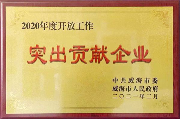 公司榮獲威海市“2020年度開(kāi)放工作突出貢獻(xiàn)企業(yè)”稱號(hào)