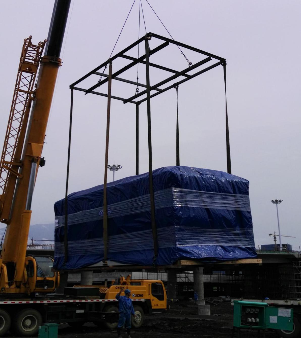 就在施工人員卯足了勁準(zhǔn)備讓這16臺(tái)設(shè)備就位的時(shí)候,天卻下起雨來(lái)。為了搶工期,大家守候在現(xiàn)場(chǎng),一邊等待雨停,一邊做一些必要的準(zhǔn)備工作。天隨人愿,中午剛過(guò)就艷陽(yáng)高照,員工們立刻行動(dòng)起來(lái),用鏟車(chē)把設(shè)備裝上拖板車(chē),再由拖板車(chē)把設(shè)備運(yùn)到安裝現(xiàn)場(chǎng)。等待在那里的一臺(tái)50噸吊車(chē),小心翼翼地從拖板車(chē)上把一臺(tái)臺(tái)風(fēng)冷設(shè)備穩(wěn)穩(wěn)地吊到已經(jīng)提前澆筑好的設(shè)備基礎(chǔ)上。